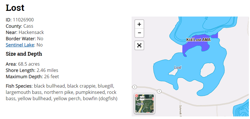 See associated data from the Minnesota DNR including fisheries surveys, lake maps, and vegetation surveys.
